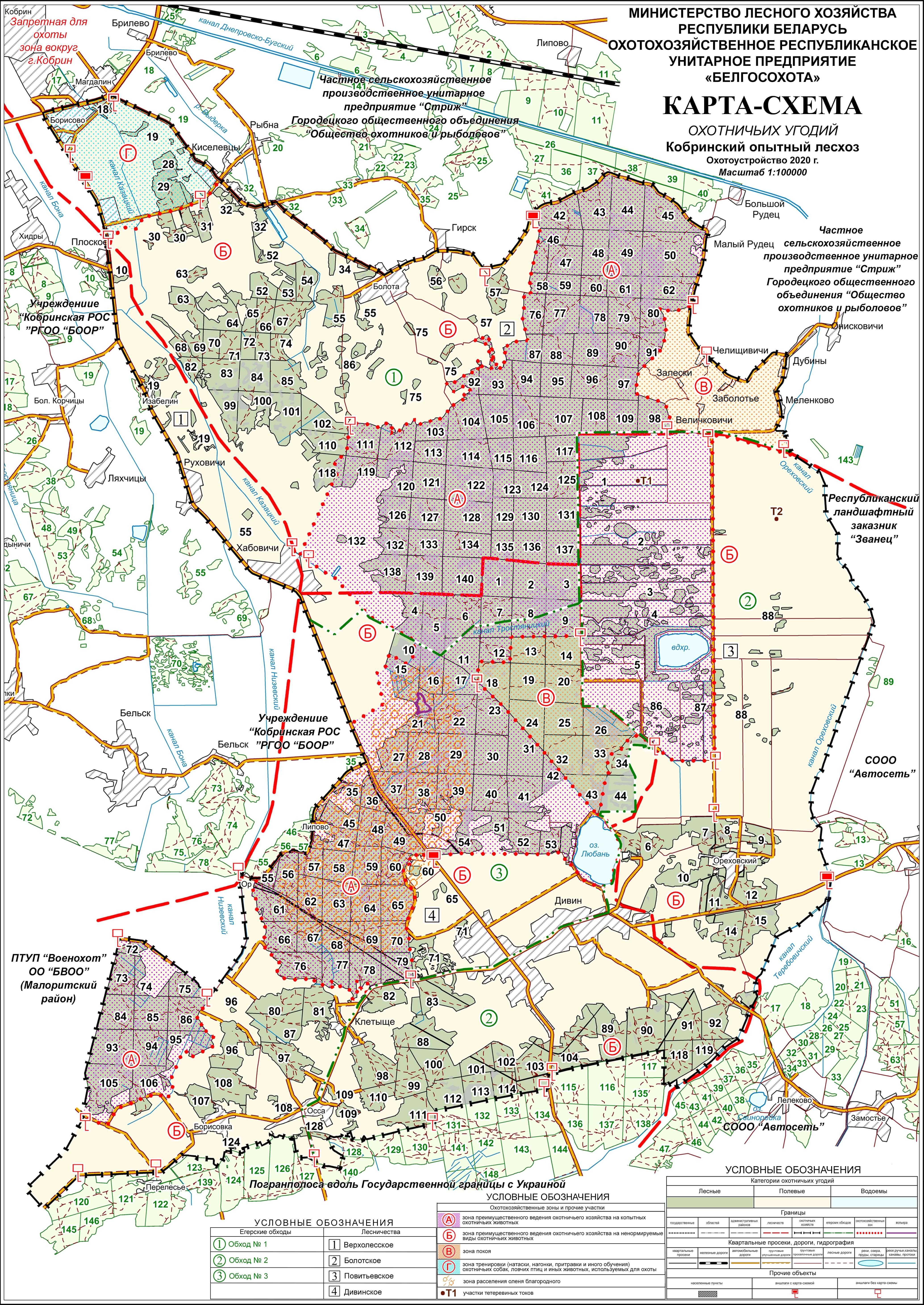 The hunting grounds of the Kobrin experimental forestry are located in the southern part of the Kobrin district of the Brest region. In the north, the hunting grounds border on the hunting grounds of the CHUP "Strizh" GOO "OOR", in the east - with the hunting grounds of the SOOO "Avtoset", in the south - with the border strip along the State border of the Republic of Belarus with Ukraine, in the west - with the hunting grounds of the institution "Kobrin ROS" RGOO "BOOR".