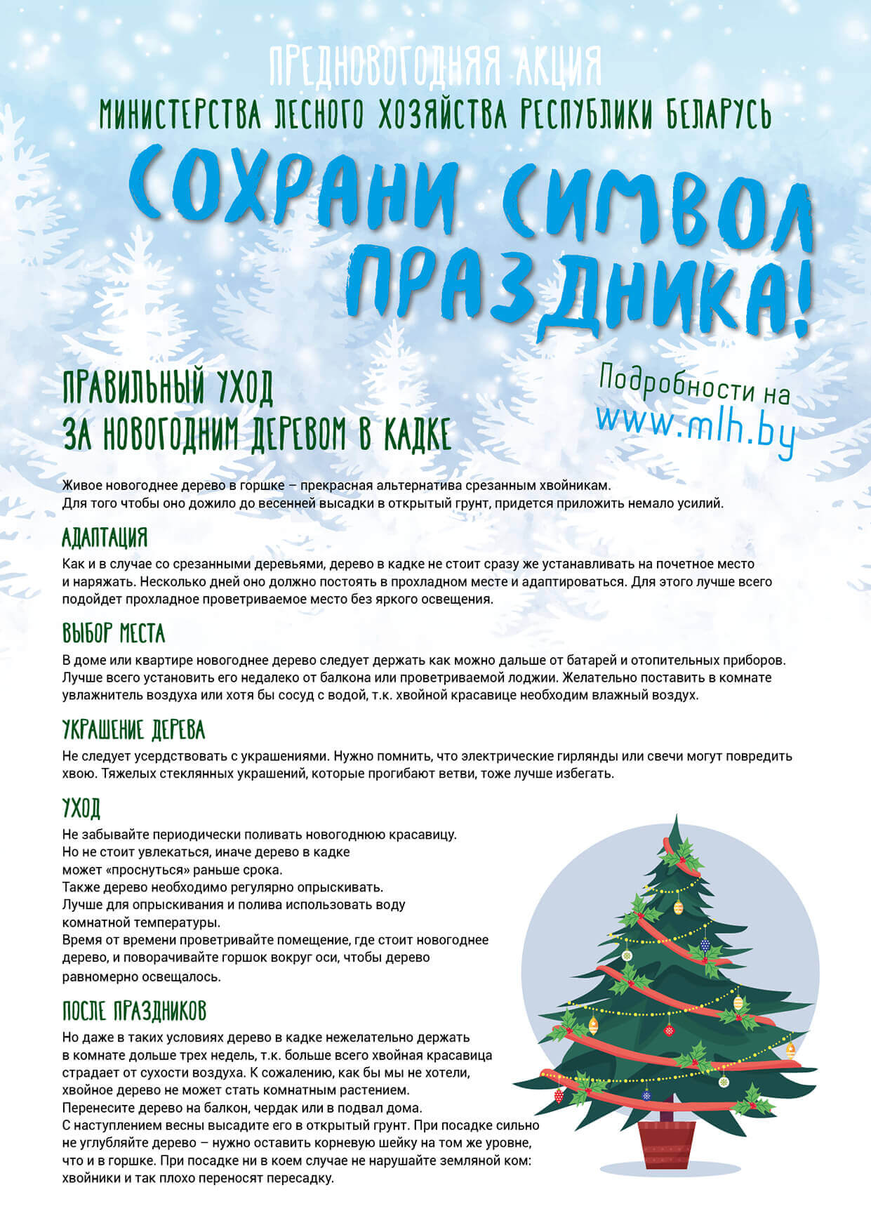 The action "Save the symbol of the holiday" will be held by the forestry enterprises of the republic and the Republican Forest Breeding and Seed Center. It will take place in all localities of the country with a population of over 30,000 people and will begin with the opening of Christmas markets. In our forestry, it will begin on December 20, 2021 and will last until December 31, 2021. On the eve of the winter holidays, the forestry enterprise will offer residents of the city to purchase New Year's trees in pots, save them until spring and plant them in the nearest forestry during the "Forest Week" campaign or on the plot. Thus, every Belarusian will be able to contribute to the greening of his small homeland.